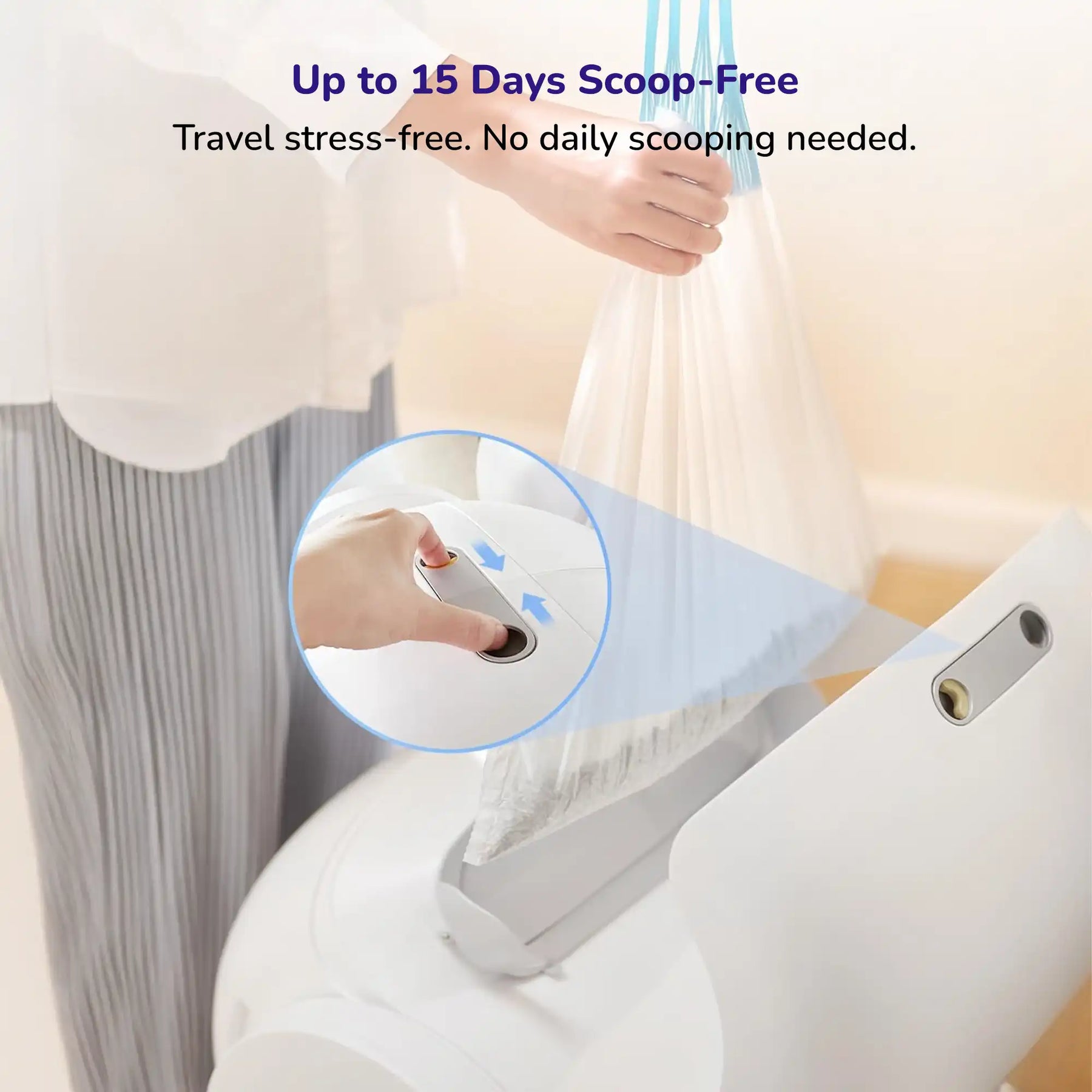 A large 9L waste bin stores waste for up to 15 days, reducing daily scooping and making maintenance effortless.